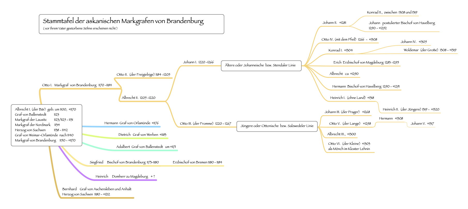 Die Stammtafel der askanischen Markgrafen in Brandenburg zeigt die dynastische Linie des Hauses Askanien, das im 12. und 13. Jahrhundert die Mark Brandenburg regierte. Sie beginnt mit Albrecht dem Bären, der als erster Markgraf von Brandenburg gilt. Die Tafel dokumentiert die Nachfolge der askanischen Herrscher bis zum Aussterben der Linie im Jahr 1320.