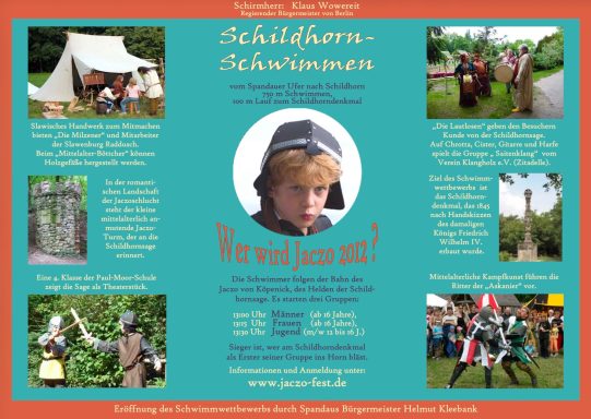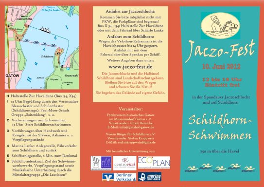 Von dieser Sage inspiriert veranstaltete gestern unter der Schirmherrschaft des regierenden Bürgermeisters der Förderverein historisches Gatow im Museumsdorf Gatow e.V und der Verein Bürger für Schildhorn e. V. erstmals das Jaczo-Fest. Damit wird an die Geburt der Mark Brandenburg erinnert, die am 11. Juni 1157 historisch ins Leben gerufen wurde und in diesem Rahmen fand auch das Schildhornschimmen statt, das an die Havelüberquerung des eben genannten Fürsten anknüpft.
