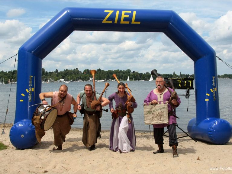 Auf der anderen Seite angekommen muss man dann noch 100 Meter einen kleinen Berg hoch zum Schildhorndenkmal. Am Ufer spielt wieder eine mittelalterliche Kapelle „die Lautlosen“, und das Publikum empfängt einen fast frenetisch auch wenn man mit ein bißchen Abstand zur Spitze ankommt.