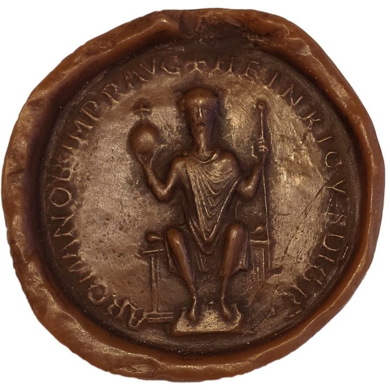 Der Plan scheiterte jedoch, und Heinrich erreichte lediglich die Wahl seines zweijährigen Sohnes Friedrich (II.) zum deutschen König. Von den Vorbereitungen zum Kreuzzug waren die letzten Jahre Heinrichs geprägt. Doch im Sommer 1198 erkrankte der Kaiser an Malaria und verstarb wenig später. Bis in Details orientierte sich der Stecher des ersten Kaisersiegels Heinrichs VI. an dem einzigen kaiserlichen Typar des Vaters Friedrich Barbarossa, das wahrscheinlich aus einem Atelier im Maasgebiet stammt und von dem wir aus den Briefen des Abtes Wibald von Stablo wissen, dass dieser die Anfertigung vermittelt hat.