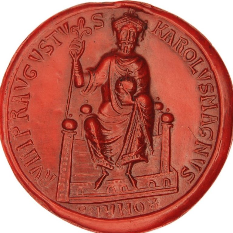 Das prächtige Aachener Siegel mit dem merkwürdig gestalteten Thronbild Karls des Grossen zählt zu den zahlreichen Kunstwerken, die das Andenken des ersten abendländischen Kaisers nach dem Untergang der Antike bewahrten.