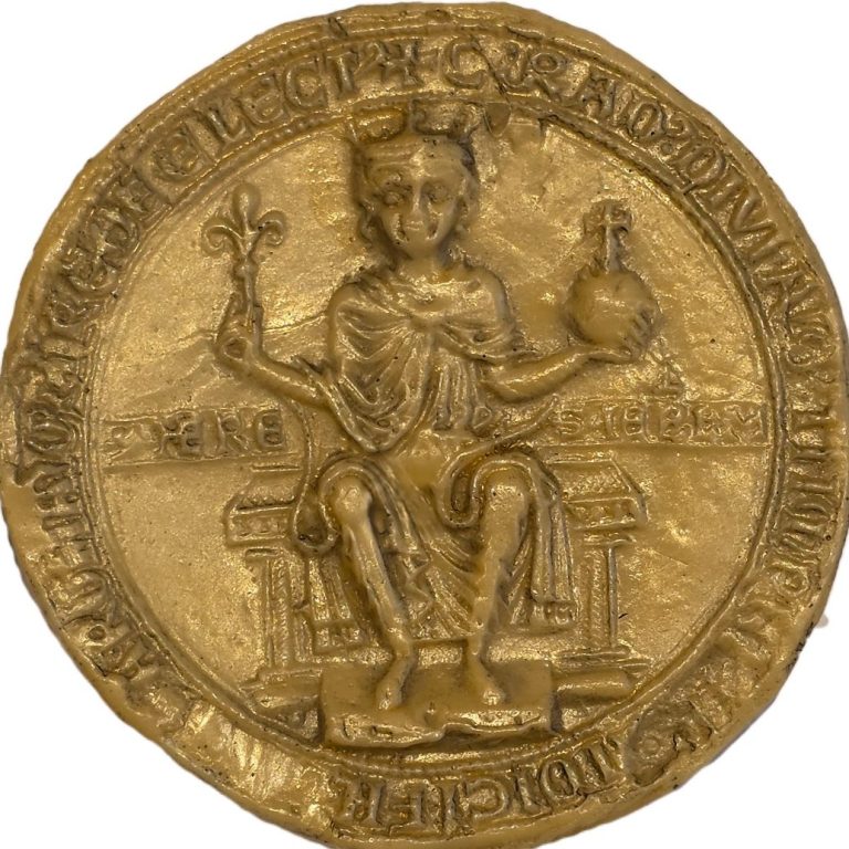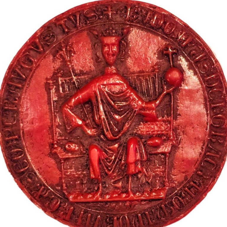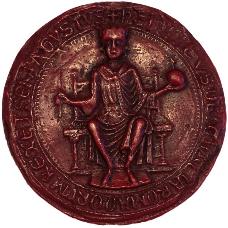 Der König thronend im Ornat, auf dem Haupt eine mit Blättern geschmückte Bügelkrone, in seiner rechten Hand das Lilienzepter, in der Linken eine Sphaira mit aufgestecktem Kreuz;