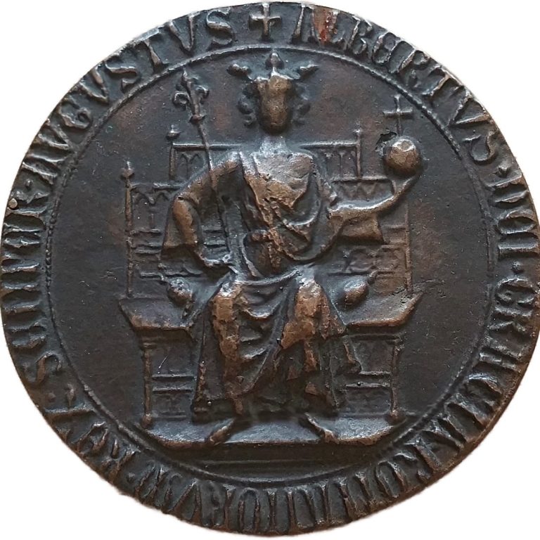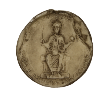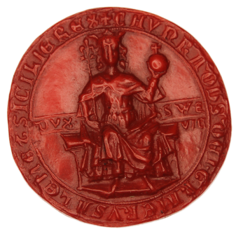 Ein weiterer Stempel vom gleichen Typ ist überliefert; er hat jedoch sowohl im Avers wie auch im Revers statt dem reitenden einen thronenden Herrscher, stellt also offenbar eine Kompromisslösung zwischen der spanischen und der deutschen Siegeltradition dar. Was unser Stück betrifft nach Posse das „dritte Königssiegel“ läßt sich leider zu Datum und Provenienz nichts sagen. Wenn dieser Stempel sich einerseits im ganzen an der offenbar verbindlichen Form des römisch-deutschen Königssiegels, des einseitigen Thronsiegels, orientiert, so fällt es doch in vielen Einzelheiten aus der Tradition heraus. So fehlt ihm beispielsweise die seit dem Anbruch des Interregnums gewöhnlich aufwendig gestaltete Lehne der Thronbank und eigenartig ist auch die Verwendung des Vogelzepters, wie es in der weit zurückliegenden Ottonen- und Salierzeit begegnete.