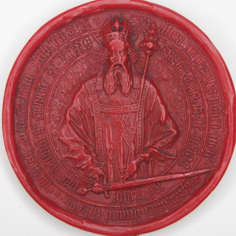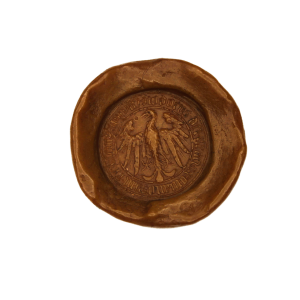 Eine solche trägt unser Stück. Schon auf dem ältesten erhaltenen Königssekret Rudolfs I. prangte der Adler im Bildfeld, zu deuten wohl als Symbol für das Reich, der geradezu zum Markenzeichen des Königssekrets wurde. Später hat man dieses Siegelbild in vielfältiger Weise, etwa mit Wappenschilden, ausgestaltet, wobei aber der Adler stets das hauptsächliche Sujet blieb. Unser Siegel dürfte wohl als Sekret des erwählten Königs Jobst anzusprechen sein.