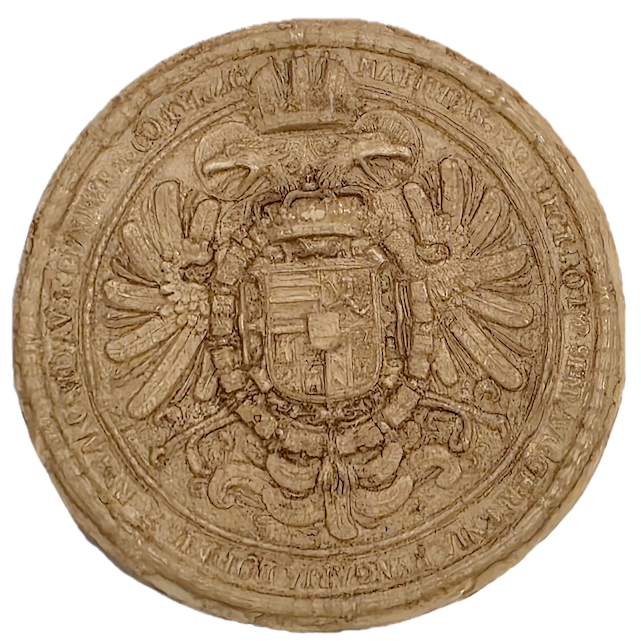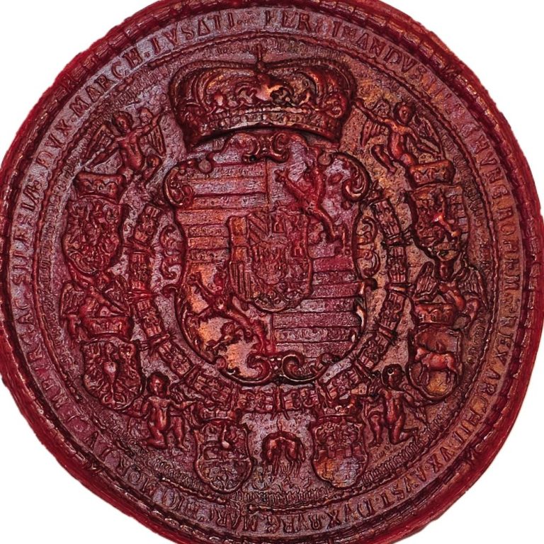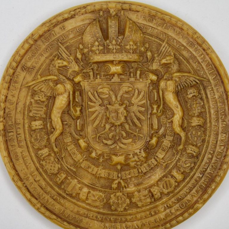 Auch beim vorliegenden Stück handelt es sich um ein Typar mit einer Spezialfunktion, nämlich um den Stempel des Kaisers, der in der für die zentralen Erblande zuständigen Kanzlei gebraucht worden ist. Darauf verweist augenfällig der unterste, mittels der Löwen deutlich in den Vorder- grund gerückte Wappenschild Alt- und Neuösterreichs. Seit Maximilian II. (1564 – 1576), der erstmals derart gestaltete Wappensiegel für Württemberg, Niederösterreich und Tirol schneiden ließ, haben die Habsburger eine Vielzahl solcher Spezialsiegel geführt, was unter anderem zur Folge hatte, dass die Typare oft mit geringfügigen Veränderungen vom Vater auf den Sohn oder vom Vorgänger auf den Nachfolger übergingen, zum Beispiel entsprechende Stempel Ferdinands II. auf Ferdinand III.