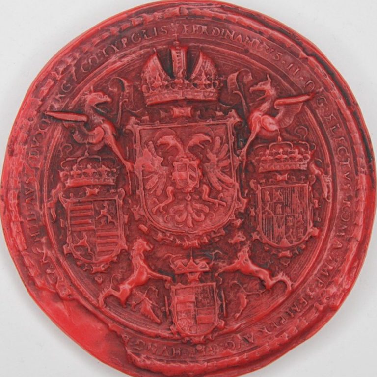 Er suchte die Kräfte im Reich gegeneinander auszuspielen, um auf diese Weise dem bourbonischen Frankreich eine hegemoniale Stellung in Europa zu verschaffen. Aufgrund der militärischen Erfolge der Franzosen hatten Kaiser und Reich im Westfälischen Frieden 1648 die Buße an Frankreich zu zahlen. Habsburg verlor sämtliche Besizzungen im Elsaß, die Festung Breisach wurde französisch, neben der Schweiz und Holland schieden die lothringischen Bistümer Metz, Toul und Verdun aus dem Reich aus. Infolge der Veränderung des politischen Gewichts zwischen Kaisertum und Reichsständen durch den Friedensvertrag zerfiel dieses endgültig in eine Vielzahl partikularer Staaten. Von den 35 Typaren Ferdinands III. stammt eine große Zahl vom gleichnamigen Vater, wobei man sich mit geringfügigen Änderungen der Umschrift begnügen konnte. Anders verhält es sich mit dem vorliegenden böhmischen Königssiegel. Der erhaltene silberne Stempel trägt auf der Rückseite das Datum (seiner Anfertigung) 1634, im Jahr der Schlacht von Nördlingen, und ist eigens für Ferdinand gearbeitet worden.