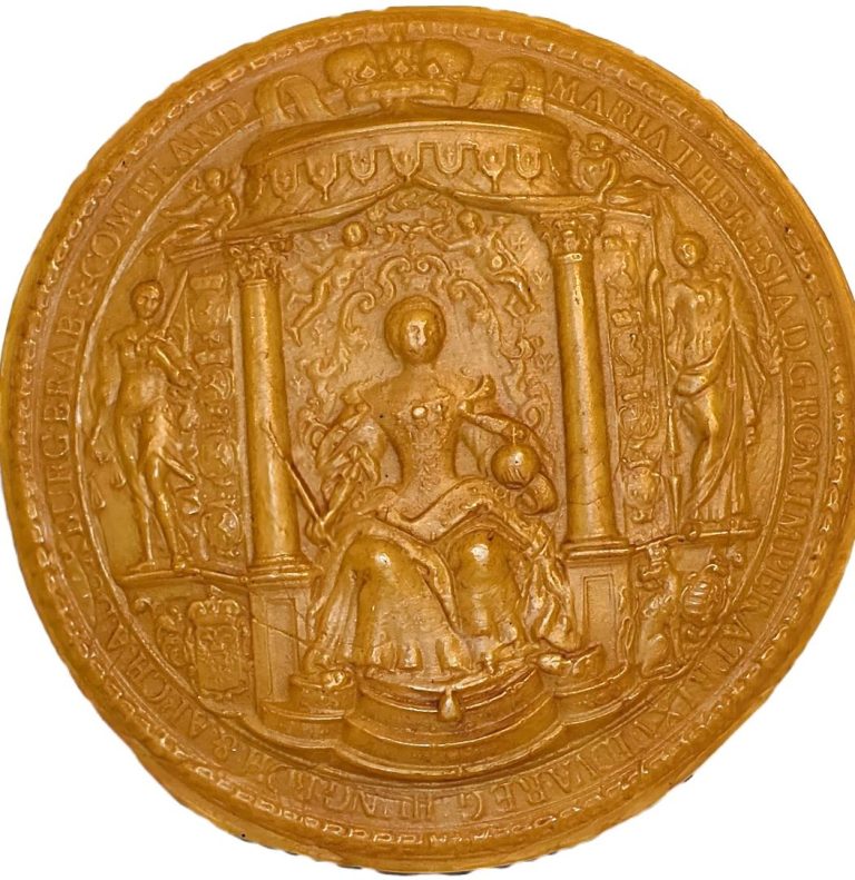 Das vorliegende, prunkvolle Exemplar der bereits verwitweten Habsburgerin für die Niederlande gehört zu den wenigen Stempeln dieses Typs, die Maria Theresia neben ihren überaus zahlreichen, mehr als ein halbes Hundert zählenden Wappensiegeln anfertigen ließ und verwendete. Ihr Bildnis auf dem Typar entspricht im großen und ganzen dem, was auch andere zeitgenössische Darstellungen überliefern.