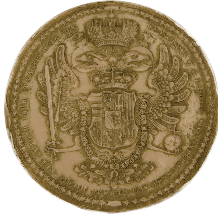 Habsburg-Lothringen sein, welches bis 1919 Bestand hatte. Die Hauptstadt Wien verdankt Franz I., der vor allem naturwissenschaftlichen Interessen nachging und sogar Erfindungen machte, den Grundstock ihrer musealen Sammlungen, das Schloß Schönbrunn den Park, den botanischen Garten und die Menagerie. Franzens Siegel ist wie die seiner unmittelbaren Vorgänger und Nachfolger ein echtes Wappensiegel mit Beifügung der Ordensabzeichen.
