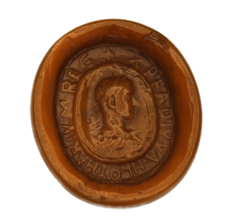 Verglichen werden kann der vorliegende Siegelabdruck des Hausmeiers Pippin mit dem Stempel aus Pippins Regierungszeit als König.