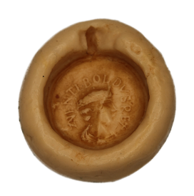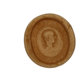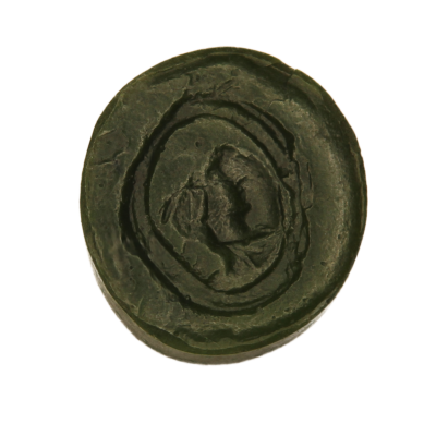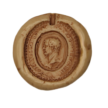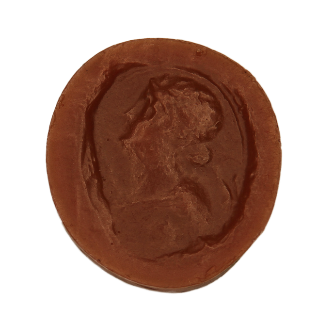 Abdruck einer antiken Gemme (25 x 20 mm) mit der barhäuptigen drapierten Büste wahrscheinlich des römischen Kaisers Antoninus Pius nach rechts.