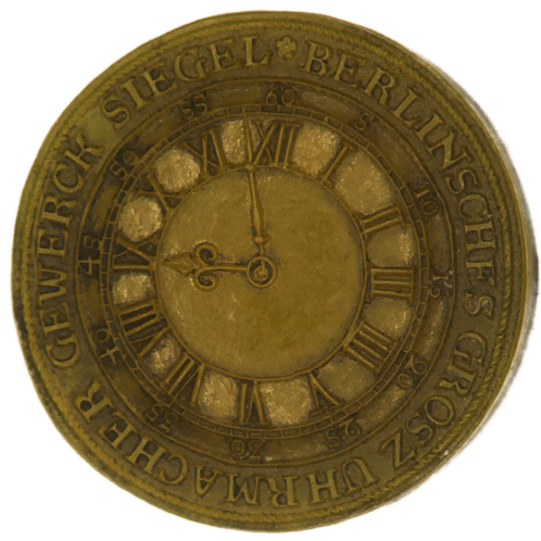 Das Rundsiegel, dessen Prägestempel im Stadtmuseum Berlin verwahrt wird, zeigt ein großes Zifferblatt mit römischen Zahlzeichen. Der Zeiger steht auf kurz vor 9 Uhr. Die bei der XII einsetzende Legende lautet: BERLINSCHES GROSZ UHRMACHER GEWERCK SIEGEL. Zwischen dem Ring mit römischen Zahlen und der Legende befindet sich ein weiterer Ring mit der Minuteneinteilung. In Schritten von 5 Minuten steht oberhalb der eine 5 bis zur 60 über der XII. Der erste Uhrmacher ist in Berlin namentlich 1577 nachweisbar. Es folgten nach dem Potsdamer Edikt 1685 Uhrmacher aus Frankreich und Neuchâtelle. Aber bereits in der ersten Hälfte des 18. Jahrhunderts erwarben 30 Uhrmacher das Bürgerrecht. 9 waren einheimische Bürgersöhne, die anderen kamen aus den verschiedenen deutschen Landen, aber auch aus der Schweiz, Salzburg und Riga. Zu unterscheiden ist zwischen Groß- und Klein- Uhrmachern, die dem Gewerk der Sporer, Schlosser, Büchsen- und Uhrmacher in Berlin und Cölln an der Spree angehörten. 1691/92 bestätigte Kurfürst Friedrich III. das von seinen Vorfahren erteilte Privileg. Im Zuge der Zunftreform wurde es 1734 aufgehoben und durch das Generalprivileg ersetzt. Es enthält u. a. genaue Angaben über das Meisterstück. Der Groß-Uhrmacher mußte „eine übersetzte Ziehe-Uhr, die die Viertel-Stunden schlägt, den Mondschein und Monatstag weist, acht Tage bis zum nächsten Aufziehen geht, mit einer Trummel-Walze und einem langen Perpendicul in einer Stube oder Zimmer angebracht werden kann" fertigen. Wenn er den Schlosserberuf erlernt hatte und auch ausüben wollte, mußte zusätzlich das für die Schlosser erforderliche Meisterstück angefertigt werden. Vom Klein-Uhrmacher verlangte man eine, Taschenuhr mit Federn, wie zu Augsburg, schlägt alle viertel Stunden, soll Sonnen- und Mond-, und auch die ungleichen Planeten weisen. Ferner ein solches Walzen- Uhrlein mit dem Mondschein." Die Klein-Uhrmacher trennten sich 1752 vom Schlossergewerk und bildeten, freilich nur in Berlin, eine besondere Innung. Erst 1788 folgten die Groß-Uhrmacher. Nicolai rühmt in seiner Geschichte Berlins die hiesigen Flöten- und Harfenuhren als unübertroffen in Deutschland, als die „feinsten musikalischen Delikatessen", die ganze Konzerte mit schönem Ton und richtiger Mensur sauber wiedergeben.