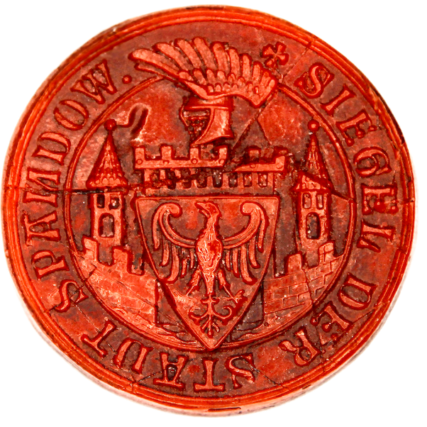 Das Rundsiegel zeigt eine Stadtmauer, seitlich dahinter zwei Türme mit spitzem Dach. Vom gewaltigen mittleren Torturm, belegt mit dem brandenburgischen Adlerschild, ist nur der Zinnenkranz sichtbar, darüber der askanische Topfhelm mit Federflug. Die Legende lautet (mit spiegelverkehrtem N): + SIEGEL DER STADT SPANDOW. Das Siegel wurde im Jahre 1861 geschaffen. Es entspricht bis auf die modernisierte Sprache der Legende dem ältesten Stadtsiegel aus dem Jahr 1289. Adlerschild, Topfhelm und Federflug ver- weisen auf die Markgrafen von Brandenburg als Stadtherren der deutschen Stadt, die im Zuge der deutschen Ostbewegung gemeinsam mit der askanischen Burganlage auf der Zitadelleninsel neben bzw. in Nachfolge einer slawischen Wehranlage und dörflichen Siedlung entstand. Das Stadtrecht erhielt sie 1232. Ein Vogt als markgräflicher Beamter wird bereits 1197 urkundlich erwähnt. Als zeitweiliger Aufenthaltsort des Markgrafen und seiner Kanzlei, sodann als Witwensitz, war die Burg im Mittelalter besonders beliebt. Die Umgestaltung zur Zitadelle durch Graf Lynar erfolgte Ende des 16. Jahrhunderts. Der mittelalterliche Juliusturm wurde berühmt als Reichsschatzkammer nach 1871, heute fesselnder Anziehungspunkt für Touristen, ebenso wie die Altstadt mit der Nikolaikirche, in der unter Kurfürst Joachim II. die Reformation in der Mark eingeführt wurde. 1852 zählte man in Spandau rund 8000 Einwohner. Bauern, Handel und Handwerk bestimmten das Bild einer märkischen Kleinstadt, die freilich auch schon Anfänge militärischer Werkstätten aufwies. Die Entwicklung zu einem bedeutenden Industriestandort und die Konzentrierung der preußischen Rüstungsindustrie in Spandau führte bis 1900 zum sprunghaften Anstieg auf knapp 60 000 Einwohner (heute rund 200 000). Sie veränderte das Sozial- und Wirtschaftsgefüge der Stadt völlig, die am 01. April 1887 zum selbständigen Stadtkreis erhoben, 1920 unter Einbeziehung von Gutsbezirken und Dörfern wie Pichelsdorf, Gatow und Kladow als 8. Bezirk in Berlin eingemeindet wurde. 1928 bis 1931 entstand als Verbindung von Produktionsstätten der Firma Siemens und Wohnanlagen die Siemensstadt mit eigenständigem Kultur- und Wirtschaftsgefüge.