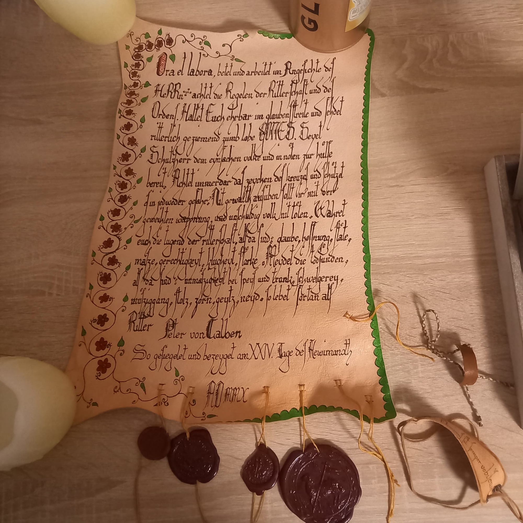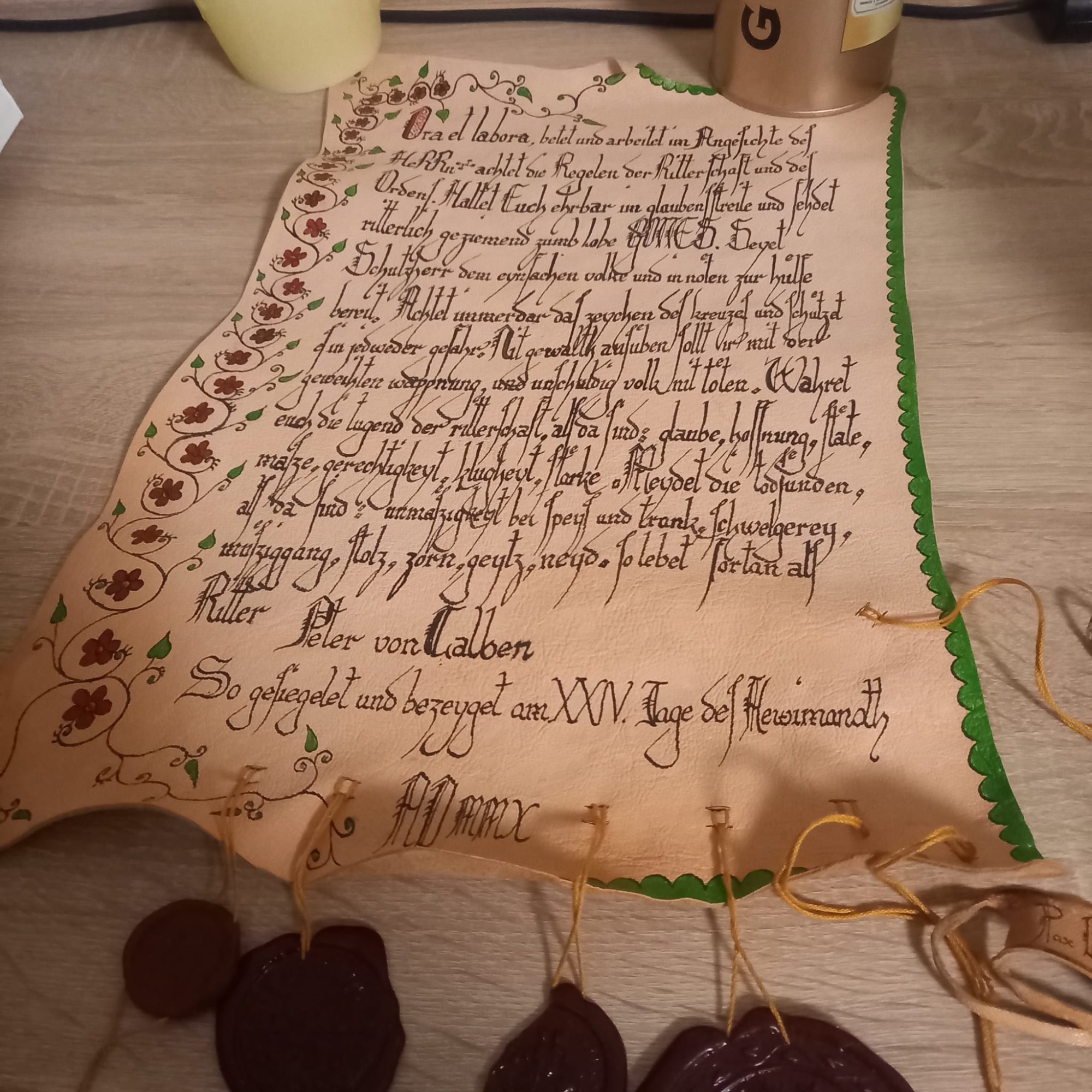 Diese schöne Ritterstandsurkunde wurde gestaltet und geschrieben vom Ritter "Peter von den Eichen"