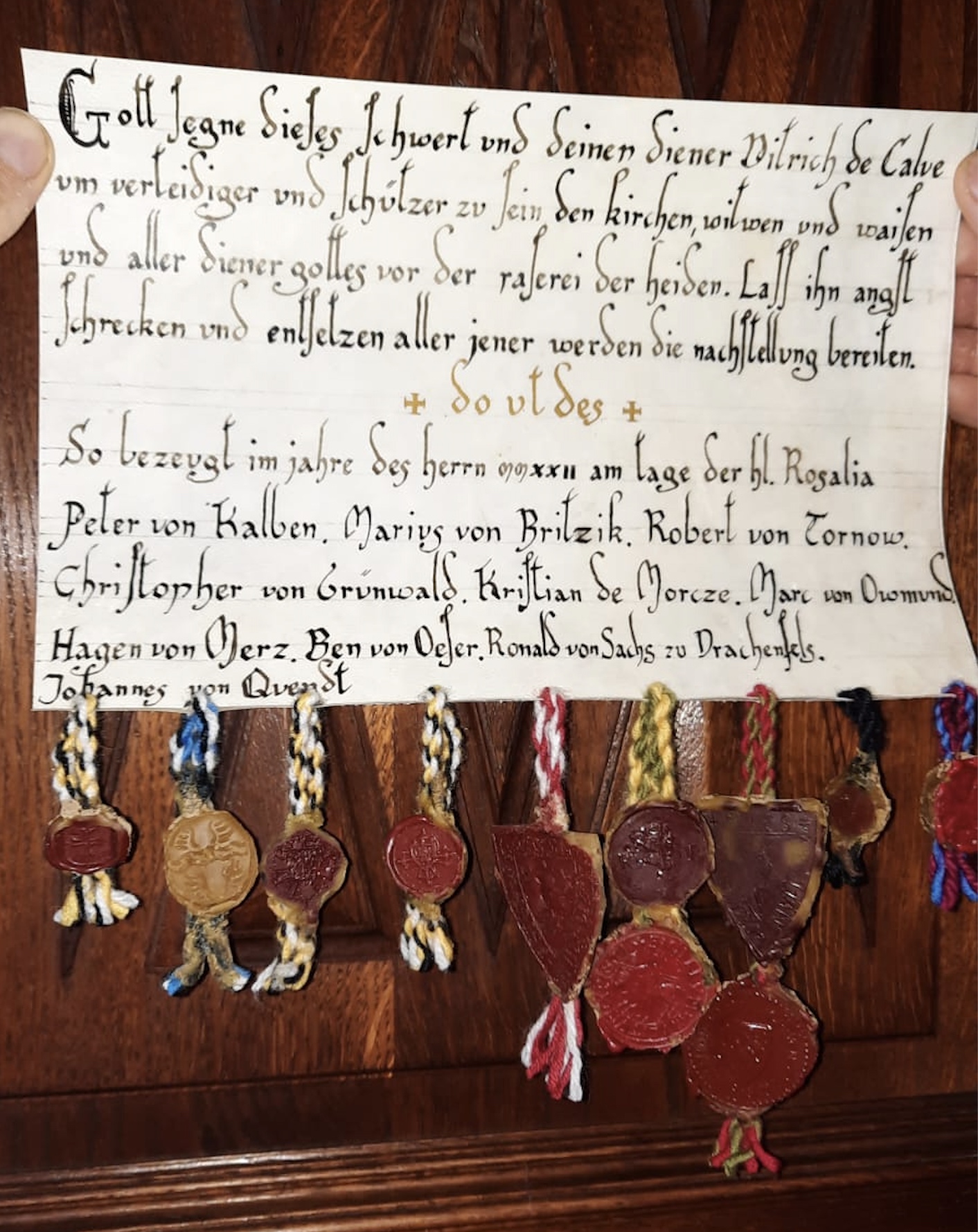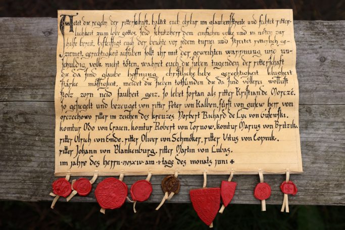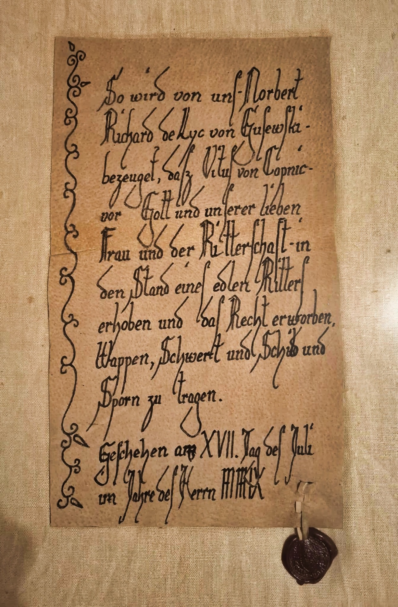 Dieser schöne Ritterbrief wurde geschrieben von Norbert Richard de Lyk von Gusjewski